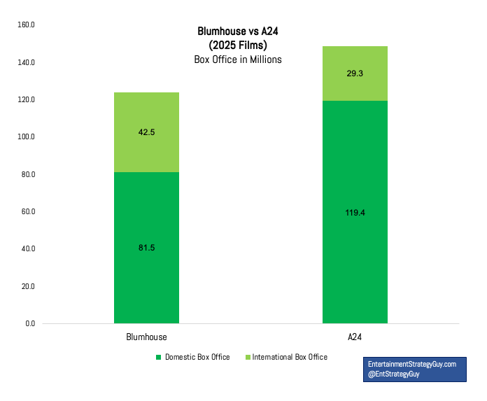 That’s right, so far, in 2025, Blumhouse has released four films, with estimated budgets of $62 million, and they made $81.5 million in the US, plus $123 million globally, which Universal keeps since they have international distribution. A24, on the other hand, has spent (roughly) $130 million to earn $118 million in the US and $141 million globally, but remember: they sell off global rights.