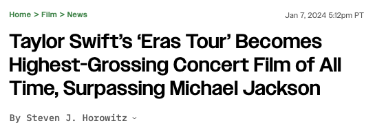 If you can remember all the way back to 2023, Taylor Swift—as a reminder, the best-selling musician of our generation, whose concert tour had just smashed global records—put a concert film in theaters. It did well. See!!!