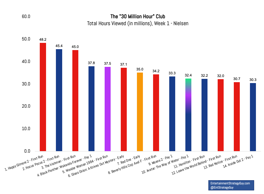 These are the elite of the elite films. (Of the hundreds of films ever released on streaming, only 14 movies have eclipsed 30 million hours, only 45 have eclipsed 20 million hours in their first week/weekend, and only three more have eclipsed 20 million hours in their second week.)