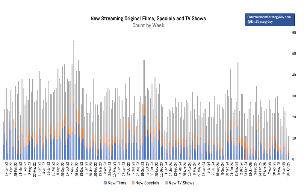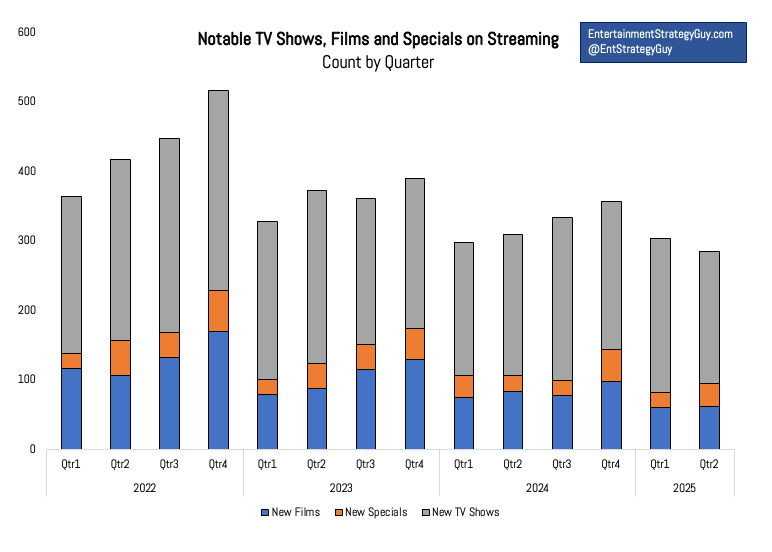 Since I cover every notable streaming film or show in my Streaming Ratings Report, I have a feel for how things are trending, whether I’m being swamped by new shows or have extra time when the number of new titles is light. Over the last two years, yeah, my workflow has gotten (somewhat) easier, with a notable decline in the number of shows, films and specials.1