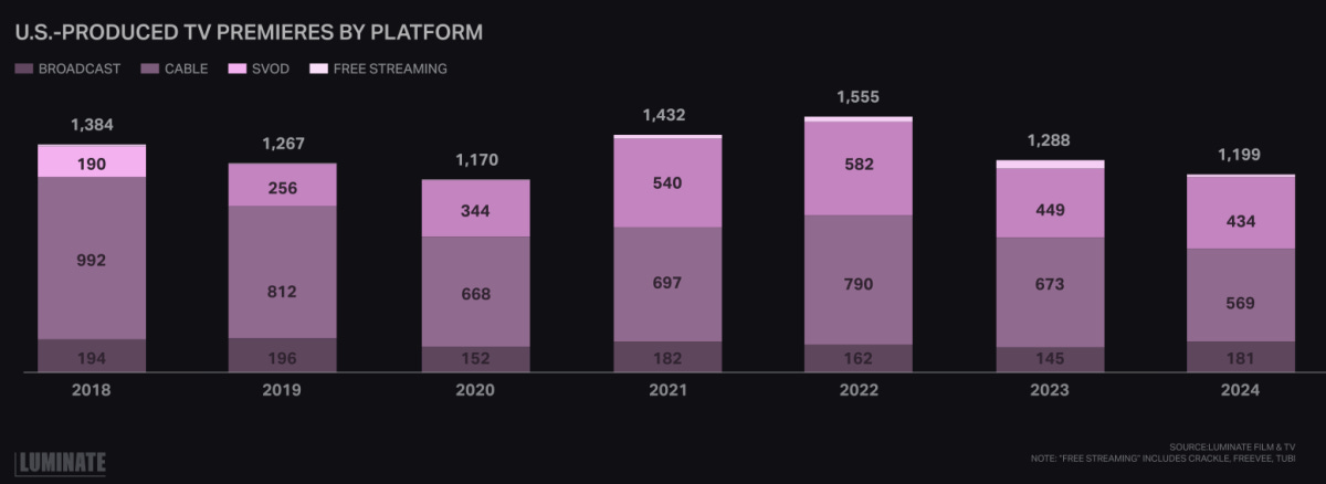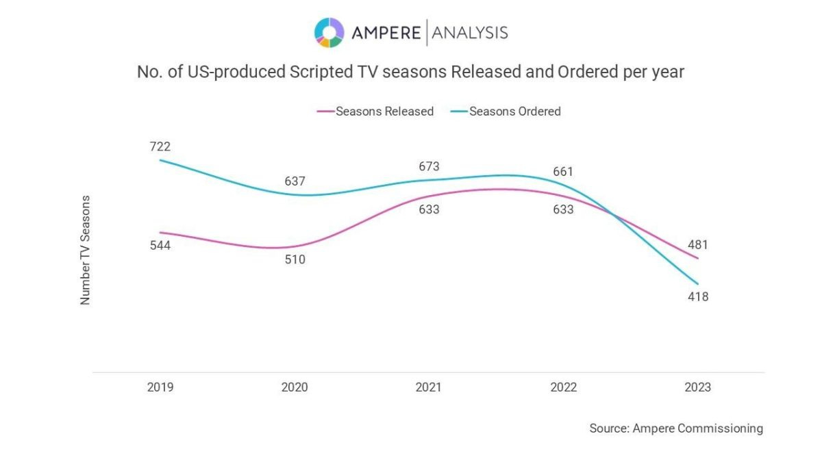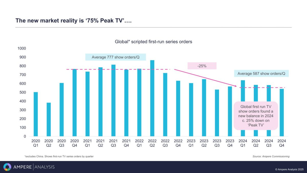 Ampere Analysis comes to a similar conclusion—looking at US data—showing the streaming bubble peak at 633 shows in 2021 and 2022, then declined to only 481 shows in 2023 and 433 last year: