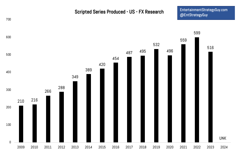 Normally, this is where I’d trot out FX Research’s count of scripted shows by year. For years, they helped form the industry narrative, and even coined the term “peak TV era”, and in 2023, generated a lot of headlines when that bubble popped. Here’s their data: